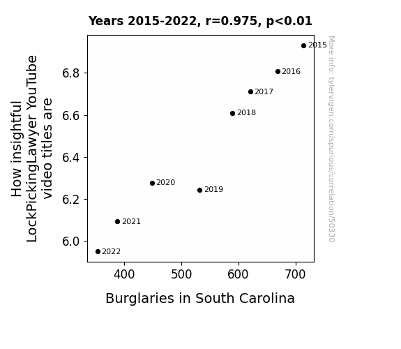 This means 95% of the change in the one variable (i.e., Burglaries in South Carolina) is predictable based on the change in the other (i.e., How insightful LockPickingLawyer YouTube video titles are) over the 8 years from 2015 through 2022.