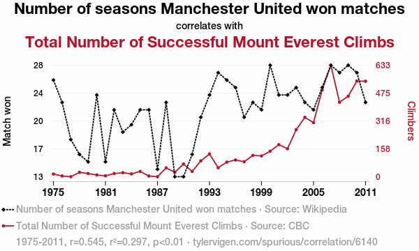 This means 29.7% of the change in the one variable (i.e., Total Number of Successful Mount Everest Climbs) is predictable based on the change in the other (i.e., Number of seasons Manchester United won matches) over the 37 years from 1975 through 2011.