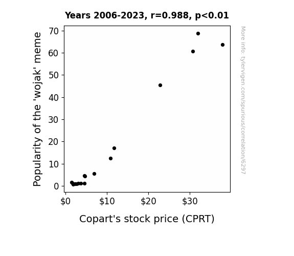 This means 97.6% of the change in the one variable (i.e., Copart's stock price (CPRT)) is predictable based on the change in the other (i.e., Popularity of the 'wojak' meme) over the 18 years from 2006 through 2023.