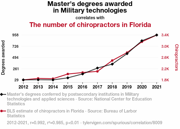 A linear line chart with years as the X-axis and two variables on the Y-axis. The first variable is Master's degrees awarded in Military technologies and the second variable is The number of chiropractors in Florida.  The chart goes from 2012 to 2021, and the two variables track closely in value over that time. Small Image