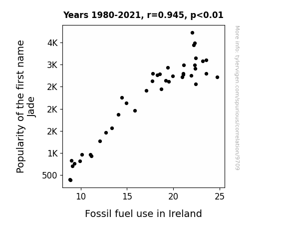 This means 89.3% of the change in the one variable (i.e., Fossil fuel use in Ireland) is predictable based on the change in the other (i.e., Popularity of the first name Jade) over the 42 years from 1980 through 2021.