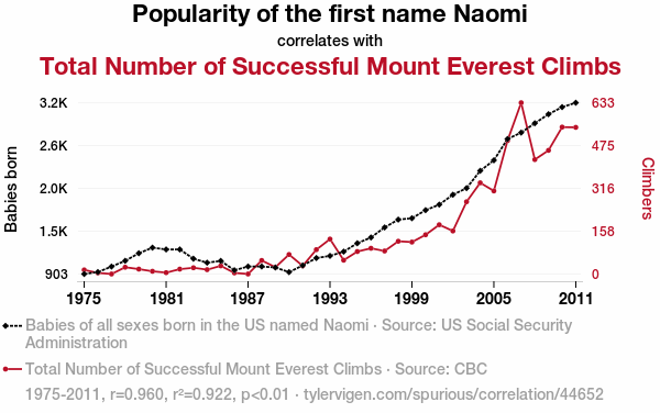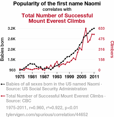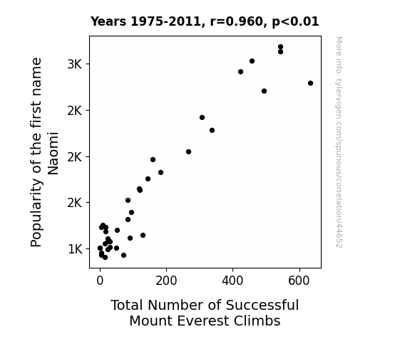 This means 92.2% of the change in the one variable (i.e., Total Number of Successful Mount Everest Climbs) is predictable based on the change in the other (i.e., Popularity of the first name Naomi) over the 37 years from 1975 through 2011.