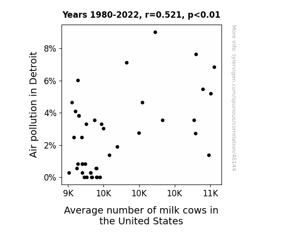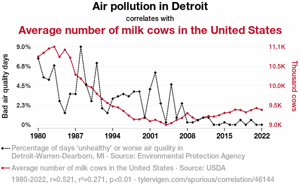 This means 27.1% of the change in the one variable (i.e., Average number of milk cows in the United States) is predictable based on the change in the other (i.e., Air pollution in Detroit) over the 43 years from 1980 through 2022.