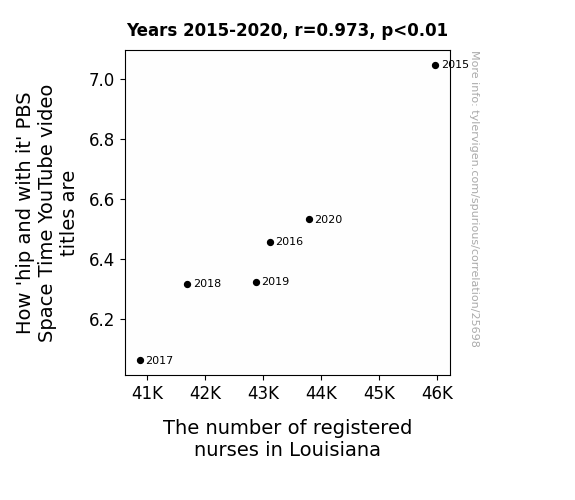 This means 94.8% of the change in the one variable (i.e., The number of registered nurses in Louisiana) is predictable based on the change in the other (i.e., How 'hip and with it' PBS Space Time YouTube video titles are) over the 6 years from 2015 through 2020.