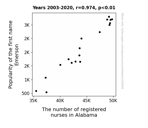 This means 94.8% of the change in the one variable (i.e., The number of registered nurses in Alabama) is predictable based on the change in the other (i.e., Popularity of the first name Emerson) over the 18 years from 2003 through 2020.