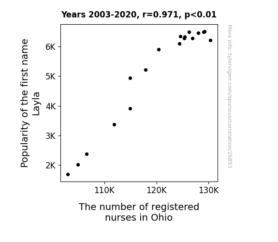 This means 94.2% of the change in the one variable (i.e., The number of registered nurses in Ohio) is predictable based on the change in the other (i.e., Popularity of the first name Layla) over the 18 years from 2003 through 2020.