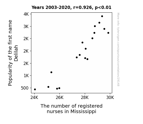 This means 85.7% of the change in the one variable (i.e., The number of registered nurses in Mississippi) is predictable based on the change in the other (i.e., Popularity of the first name Delilah) over the 18 years from 2003 through 2020.