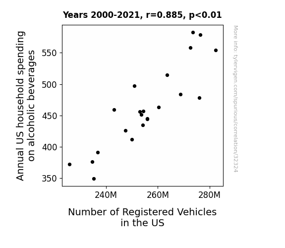 This means 78.3% of the change in the one variable (i.e., Number of Registered Vehicles in the US) is predictable based on the change in the other (i.e., Annual US household spending on alcoholic beverages) over the 22 years from 2000 through 2021.