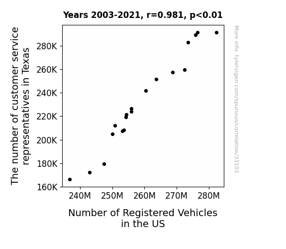 This means 96.3% of the change in the one variable (i.e., Number of Registered Vehicles in the US) is predictable based on the change in the other (i.e., The number of customer service representatives in Texas) over the 19 years from 2003 through 2021.