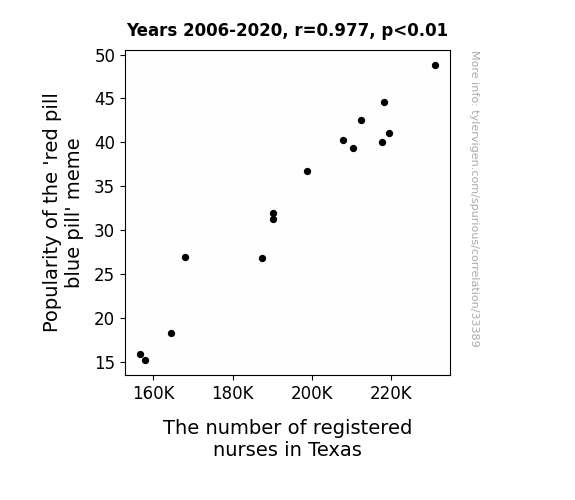 This means 95.4% of the change in the one variable (i.e., The number of registered nurses in Texas) is predictable based on the change in the other (i.e., Popularity of the 'red pill blue pill' meme) over the 15 years from 2006 through 2020.