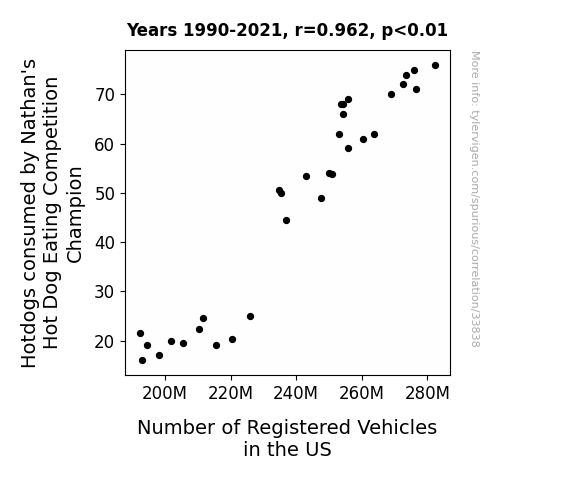 This means 92.6% of the change in the one variable (i.e., Number of Registered Vehicles in the US) is predictable based on the change in the other (i.e., Hotdogs consumed by Nathan's Hot Dog Eating Competition Champion) over the 32 years from 1990 through 2021.