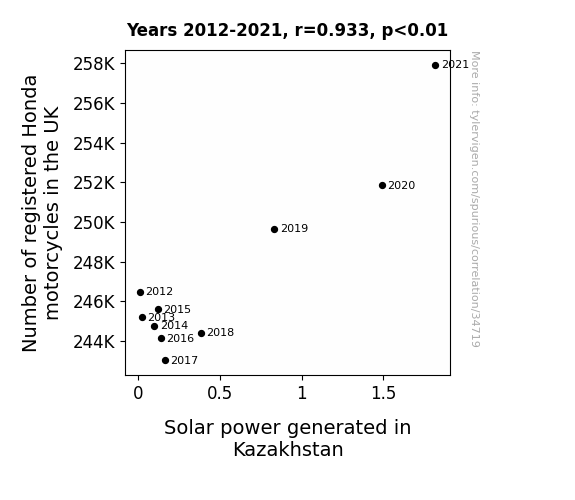 This means 87.1% of the change in the one variable (i.e., Solar power generated in Kazakhstan) is predictable based on the change in the other (i.e., Number of registered Honda motorcycles in the UK) over the 10 years from 2012 through 2021.