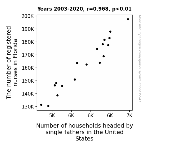This means 93.7% of the change in the one variable (i.e., Number of households headed by single fathers in the United States) is predictable based on the change in the other (i.e., The number of registered nurses in Florida) over the 18 years from 2003 through 2020.