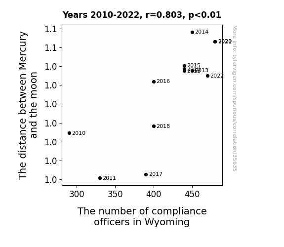 This means 64.5% of the change in the one variable (i.e., The number of compliance officers in Wyoming) is predictable based on the change in the other (i.e., The distance between Mercury and the moon) over the 13 years from 2010 through 2022.