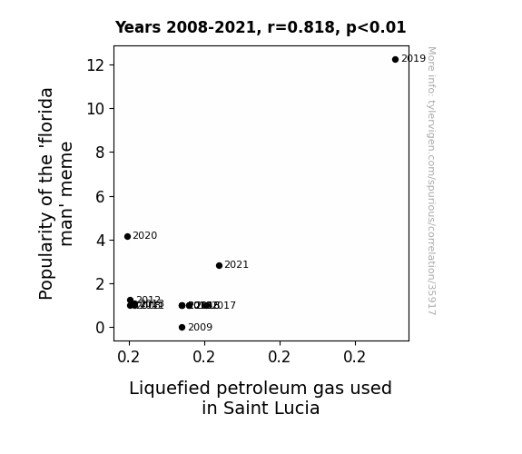 This means 67% of the change in the one variable (i.e., Liquefied petroleum gas used in Saint Lucia) is predictable based on the change in the other (i.e., Popularity of the 'florida man' meme) over the 14 years from 2008 through 2021.