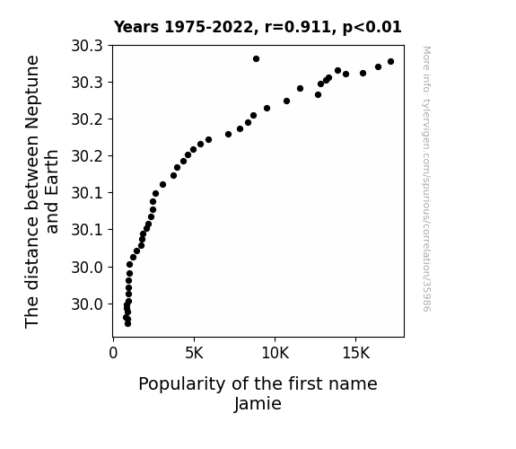 This means 83.1% of the change in the one variable (i.e., Popularity of the first name Jamie) is predictable based on the change in the other (i.e., The distance between Neptune and Earth) over the 48 years from 1975 through 2022.