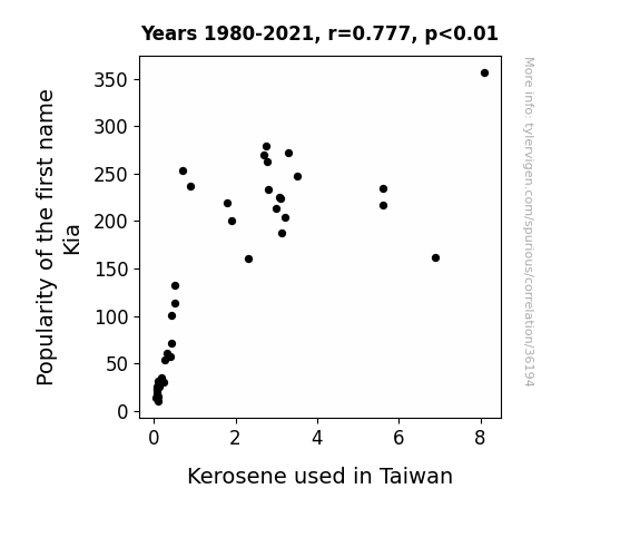 This means 60.4% of the change in the one variable (i.e., Kerosene used in Taiwan) is predictable based on the change in the other (i.e., Popularity of the first name Kia) over the 42 years from 1980 through 2021.
