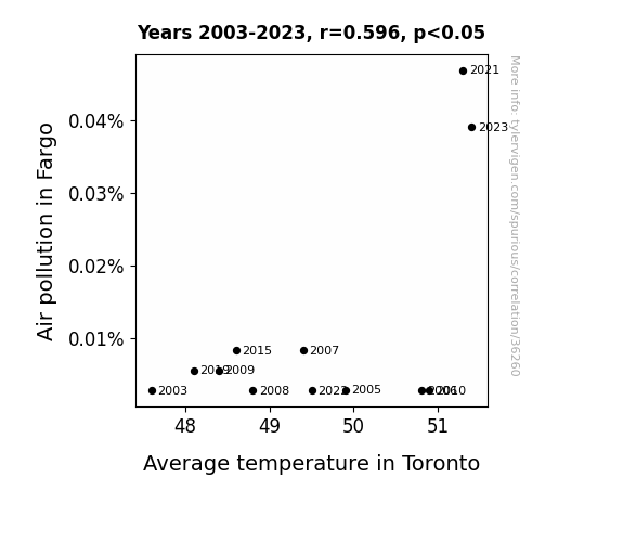 This means 35.5% of the change in the one variable (i.e., Average temperature in Toronto) is predictable based on the change in the other (i.e., Air pollution in Fargo) over the 12 years from 2003 through 2023.