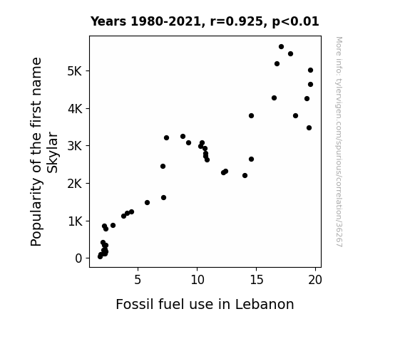This means 85.6% of the change in the one variable (i.e., Fossil fuel use in Lebanon) is predictable based on the change in the other (i.e., Popularity of the first name Skylar) over the 42 years from 1980 through 2021.