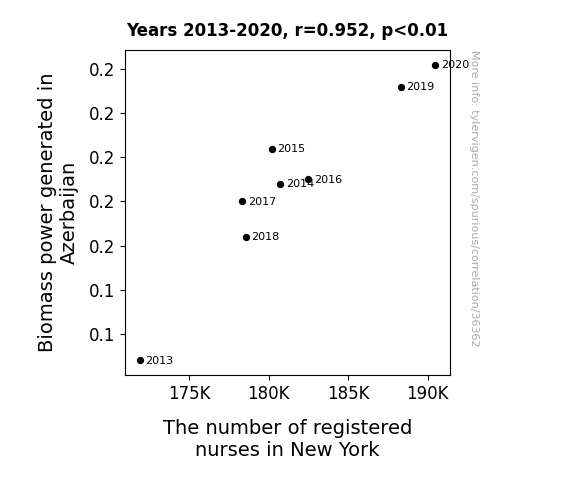 This means 90.7% of the change in the one variable (i.e., The number of registered nurses in New York) is predictable based on the change in the other (i.e., Biomass power generated in Azerbaijan) over the 8 years from 2013 through 2020.