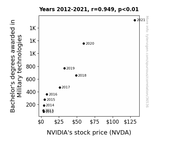 This means 90.1% of the change in the one variable (i.e., NVIDIA's stock price (NVDA)) is predictable based on the change in the other (i.e., Bachelor's degrees awarded in Military technologies) over the 10 years from 2012 through 2021.