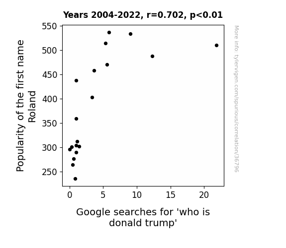 This means 49.2% of the change in the one variable (i.e., Google searches for 'who is donald trump') is predictable based on the change in the other (i.e., Popularity of the first name Roland) over the 19 years from 2004 through 2022.