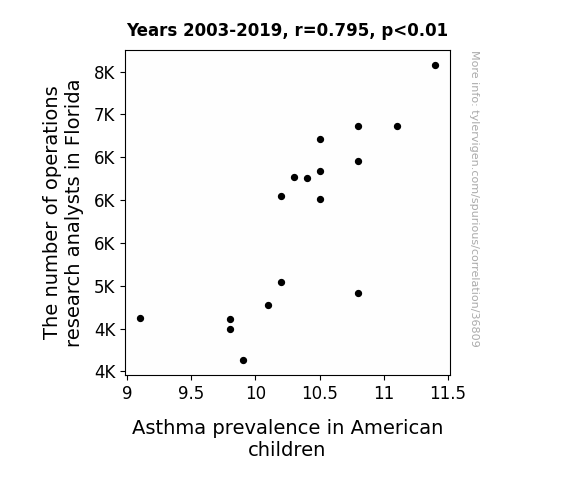 This means 63.2% of the change in the one variable (i.e., Asthma prevalence in American children) is predictable based on the change in the other (i.e., The number of operations research analysts in Florida) over the 17 years from 2003 through 2019.