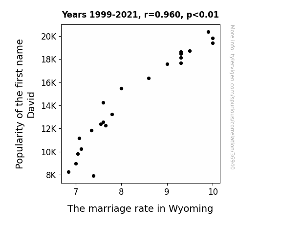This means 92.2% of the change in the one variable (i.e., The marriage rate in Wyoming) is predictable based on the change in the other (i.e., Popularity of the first name David) over the 23 years from 1999 through 2021.