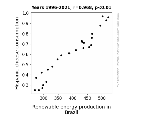 This means 93.8% of the change in the one variable (i.e., Renewable energy production in Brazil) is predictable based on the change in the other (i.e., Hispanic cheese consumption) over the 26 years from 1996 through 2021.