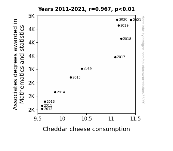 This means 93.5% of the change in the one variable (i.e., Cheddar cheese consumption) is predictable based on the change in the other (i.e., Associates degrees awarded in Mathematics and statistics) over the 11 years from 2011 through 2021.