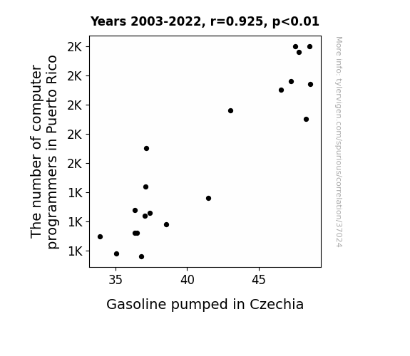 This means 85.6% of the change in the one variable (i.e., Gasoline pumped in Czechia) is predictable based on the change in the other (i.e., The number of computer programmers in Puerto Rico) over the 20 years from 2003 through 2022.