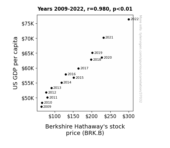 This means 96% of the change in the one variable (i.e., Berkshire Hathaway's stock price (BRK.B)) is predictable based on the change in the other (i.e., US GDP per capita) over the 14 years from 2009 through 2022.