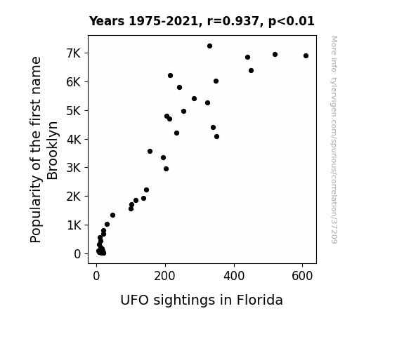 This means 87.9% of the change in the one variable (i.e., UFO sightings in Florida) is predictable based on the change in the other (i.e., Popularity of the first name Brooklyn) over the 47 years from 1975 through 2021.