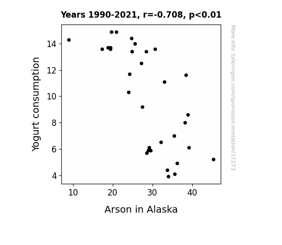 This means 50.1% of the change in the one variable (i.e., Arson in Alaska) is predictable based on the change in the other (i.e., Yogurt consumption) over the 32 years from 1990 through 2021.