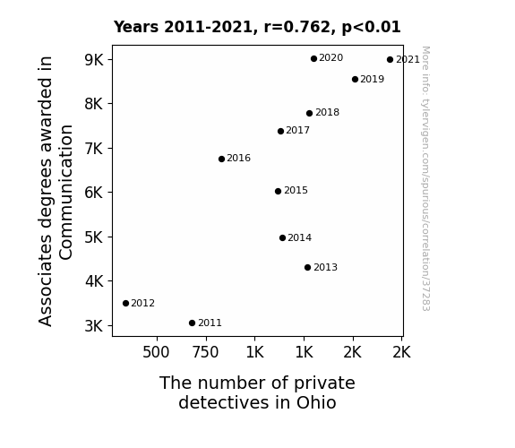 This means 58.1% of the change in the one variable (i.e., The number of private detectives in Ohio) is predictable based on the change in the other (i.e., Associates degrees awarded in Communication) over the 11 years from 2011 through 2021.
