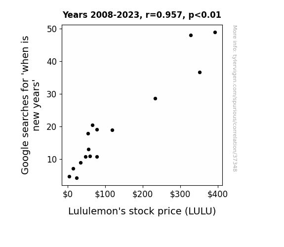 This means 91.6% of the change in the one variable (i.e., Lululemon's stock price (LULU)) is predictable based on the change in the other (i.e., Google searches for 'when is new years') over the 16 years from 2008 through 2023.