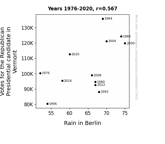 This means 32.2% of the change in the one variable (i.e., Rain in Berlin) is predictable based on the change in the other (i.e., Votes for the Republican Presidential candidate in Vermont) over the 12 years from 1976 through 2020.