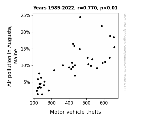 This means 59.3% of the change in the one variable (i.e., Motor vehicle thefts) is predictable based on the change in the other (i.e., Air pollution in Augusta, Maine) over the 38 years from 1985 through 2022.