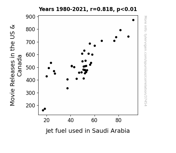This means 66.9% of the change in the one variable (i.e., Jet fuel used in Saudi Arabia) is predictable based on the change in the other (i.e., Movie Releases in the US & Canada) over the 42 years from 1980 through 2021.