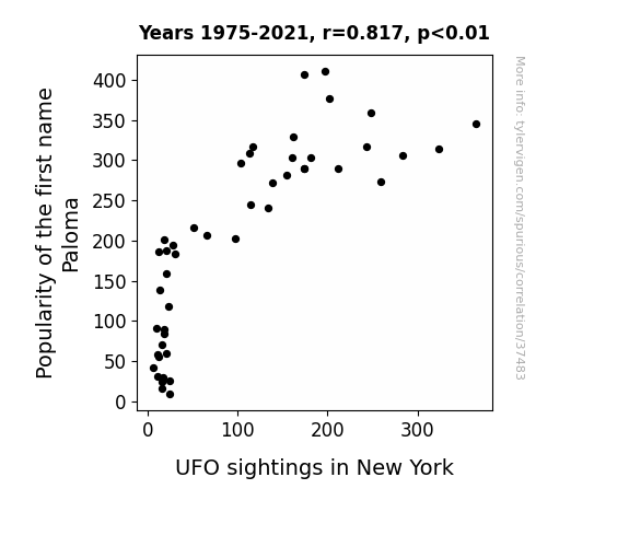 This means 66.7% of the change in the one variable (i.e., UFO sightings in New York) is predictable based on the change in the other (i.e., Popularity of the first name Paloma) over the 47 years from 1975 through 2021.