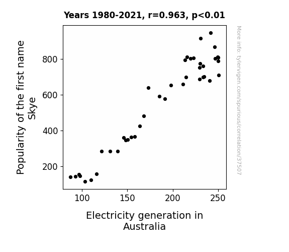 This means 92.7% of the change in the one variable (i.e., Electricity generation in Australia) is predictable based on the change in the other (i.e., Popularity of the first name Skye) over the 42 years from 1980 through 2021.