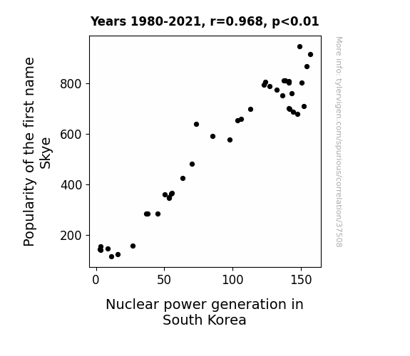This means 93.8% of the change in the one variable (i.e., Nuclear power generation in South Korea) is predictable based on the change in the other (i.e., Popularity of the first name Skye) over the 42 years from 1980 through 2021.