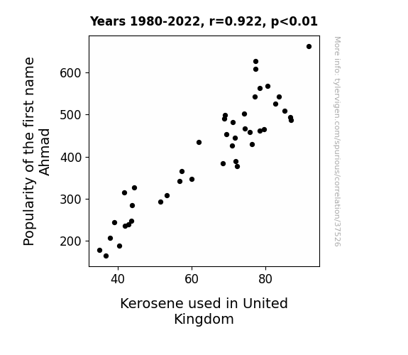 This means 85.1% of the change in the one variable (i.e., Kerosene used in United Kingdom) is predictable based on the change in the other (i.e., Popularity of the first name Ahmad) over the 43 years from 1980 through 2022.