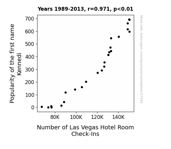 This means 94.3% of the change in the one variable (i.e., Number of Las Vegas Hotel Room Check-Ins) is predictable based on the change in the other (i.e., Popularity of the first name Kennedi) over the 25 years from 1989 through 2013.