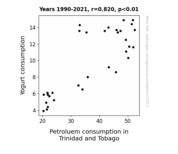 This means 67.3% of the change in the one variable (i.e., Petroluem consumption in Trinidad and Tobago) is predictable based on the change in the other (i.e., Yogurt consumption) over the 32 years from 1990 through 2021.
