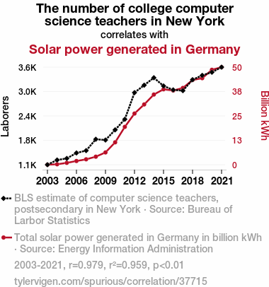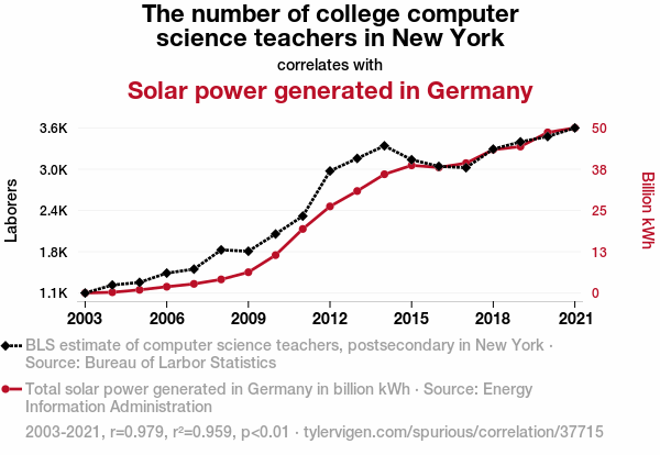 This means 95.9% of the change in the one variable (i.e., Solar power generated in Germany) is predictable based on the change in the other (i.e., The number of college computer science teachers in New York) over the 19 years from 2003 through 2021.