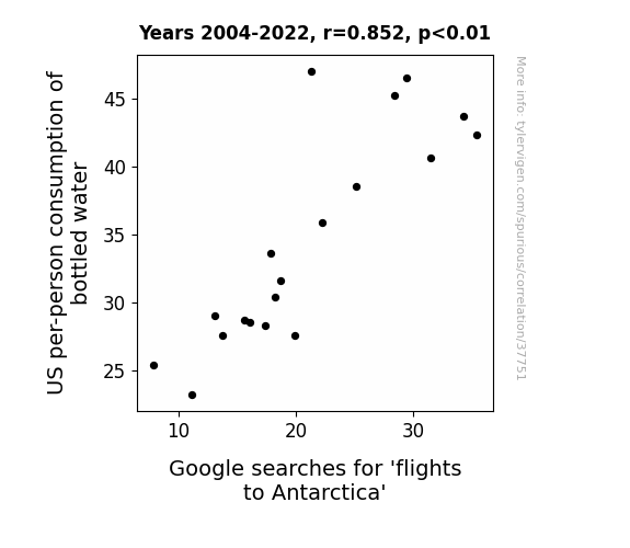 This means 72.6% of the change in the one variable (i.e., Google searches for 'flights to Antarctica') is predictable based on the change in the other (i.e., US per-person consumption of bottled water) over the 19 years from 2004 through 2022.