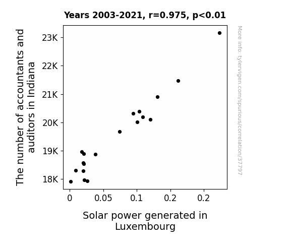 This means 95.1% of the change in the one variable (i.e., Solar power generated in Luxembourg) is predictable based on the change in the other (i.e., The number of accountants and auditors in Indiana) over the 19 years from 2003 through 2021.