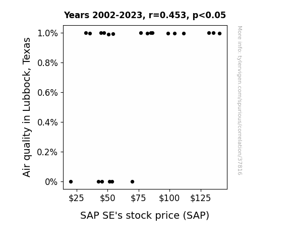 This means 20.5% of the change in the one variable (i.e., SAP SE's stock price (SAP)) is predictable based on the change in the other (i.e., Air quality in Lubbock, Texas) over the 22 years from 2002 through 2023.