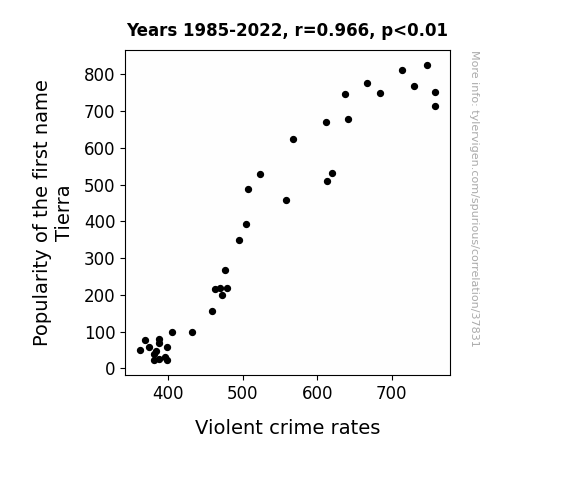 This means 93.3% of the change in the one variable (i.e., Violent crime rates) is predictable based on the change in the other (i.e., Popularity of the first name Tierra) over the 38 years from 1985 through 2022.